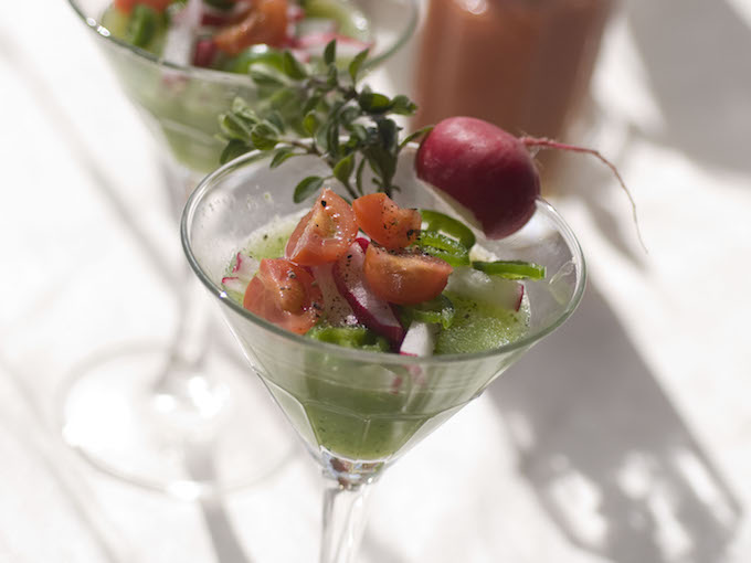 旬野菜のキュウリを使って爽やかスムージー♪ガラスの器に盛りつけて、華やかな前菜やパーティメニューにも!