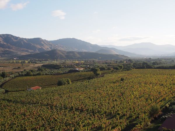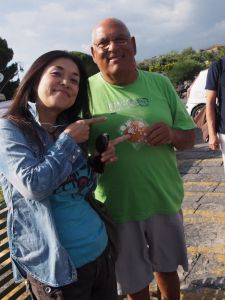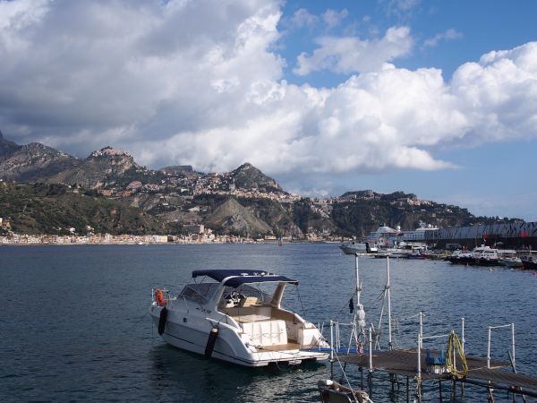 名だたるワイナリーが連なるエトナ山北壁エリアを通り、エトナ山特有の葡萄栽培方式(アルベレッロ・エトネオ)を眺め、下界、すなわちシチリア東岸に降りると、「タオルミーナを一望できる場所で記念写真を撮ろう!」とジャルディーニ・ナクソスの港を経由。