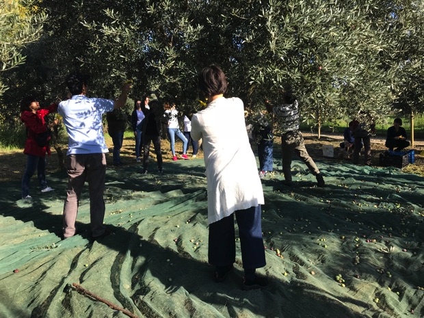 脳の運動の後は、身体の運動。午後は、いよいよ農家さんでオリーブ収穫体験です。