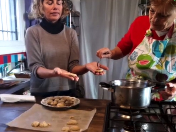 愛を伝えるメッセージとしてサヴォイア王家の依頼で発明されたというバーチ・ディ・ダーマ。「ヘーゼルナッツの香りが決め手」ということで、ナッツを砕き、粉にするところからスタート。