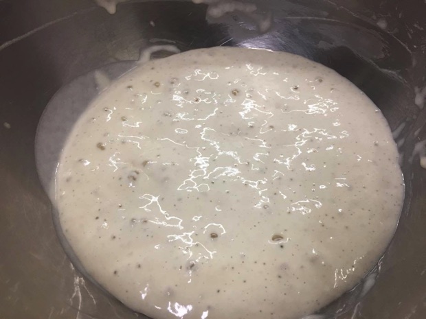 2. 小麦粉に水と、ビール酵母、砂糖、塩を加え、混ぜてから約30分休ませて、発酵させる。