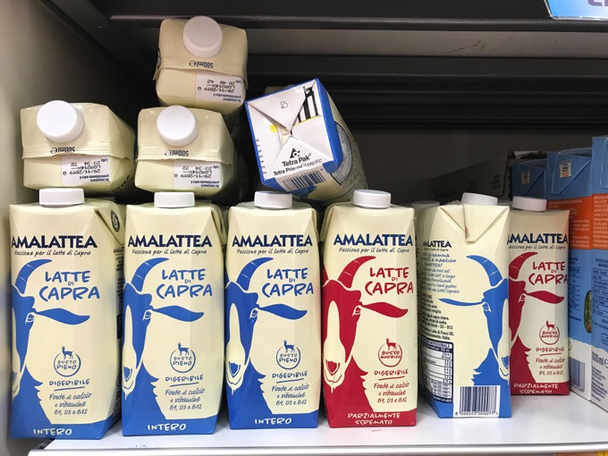 昨今、イタリアではヤギ乳ブーム。ライトでヘルシー、アレルギーの人でも飲めるため、一般的なスーパーマーケットの牛乳コーナーにもヤギ乳パックが売られています。
