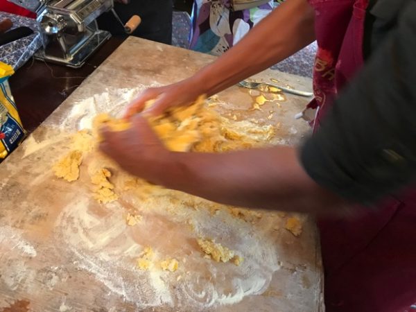 そして、手打ちタヤリン作り!生地をこねてこねて、休ませて。薄く延ばして、細ーくカットしていきます。