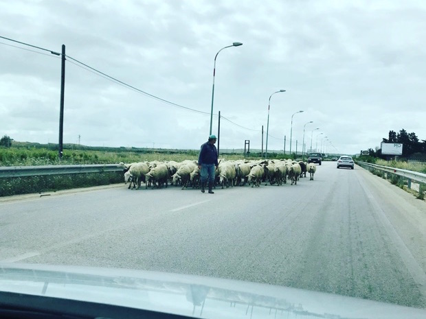 車線をはみ出す羊の大群のために、スピードを落としたり一時停止したり。