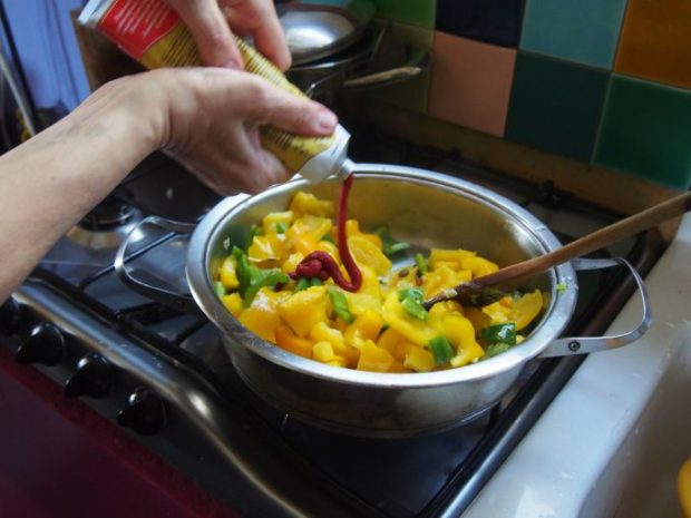 メイン(?)のアチューゲ・アル・ヴェルデの前に、ピエモンテ流のペペロナータをサクッと作るクララちゃん。