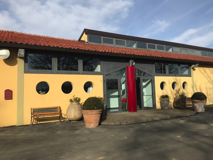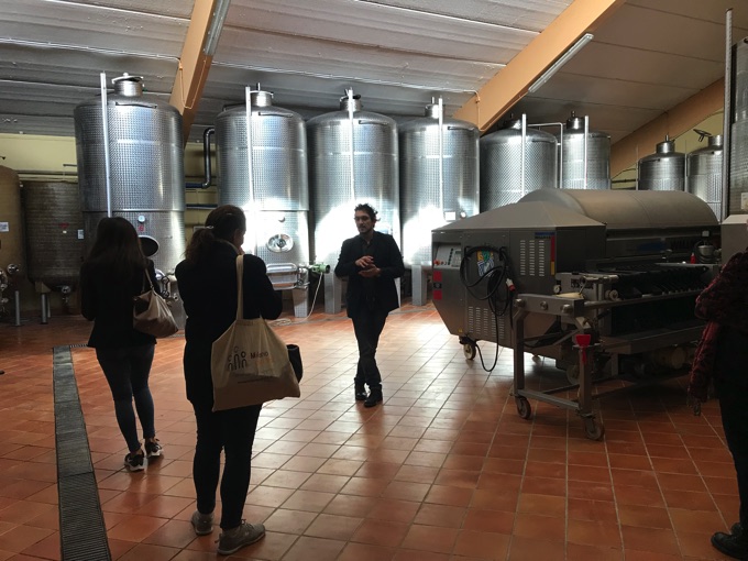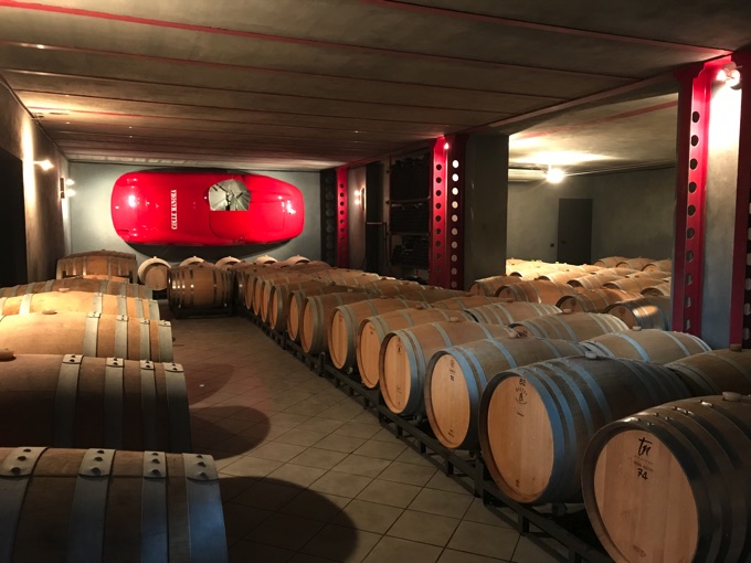 担当ニコロさんのご案内でミラノ風モダンのワイナリーを見学させていただいていたら、