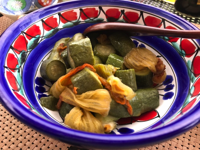 花ズッキーニやナスの蒸し炒め。シチリア料理を和風アレンジで。