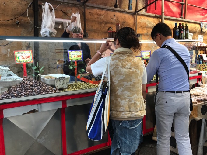 某有名トラットリアさんも仕入れる穴場のオリーブ専門屋台で、自家製“オリーブの塩漬け”をお味見。
