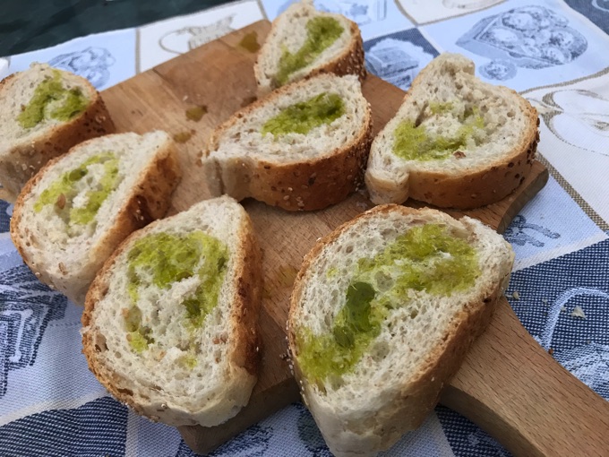 そして、マンフレディ社長との会談からバルベラ家の田舎メニューでランチです。もちろん、アペリティーボは搾りたてのオイルから!