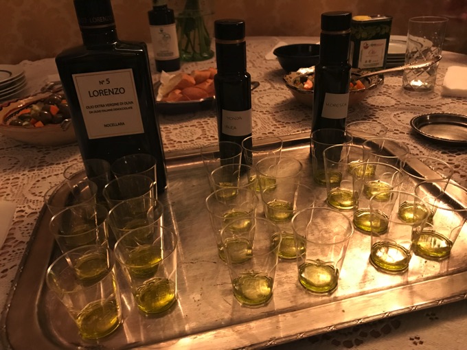 シチリアのオリーブオイル視察はまだまだ終わりません。夕方からは、アペリティーボを兼ねたオリーブオイルテイスティングで、品種の違い等を体験です。