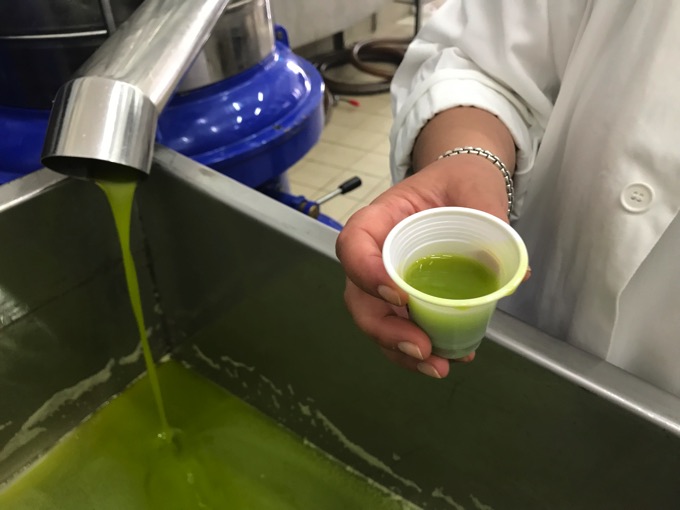 各農家さんが持ち寄るオリーブ搾油のオーガナイズシステムを視察したら、お約束の搾りたてオリーブオイルの試食です!